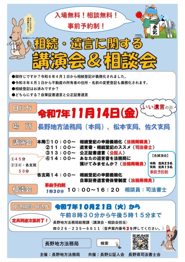 長野県司法書士会では、長野地方法務局、長野公証人会との共催より「相続・遺言に関する講演会&相談会」を 下記のとおり開催します。