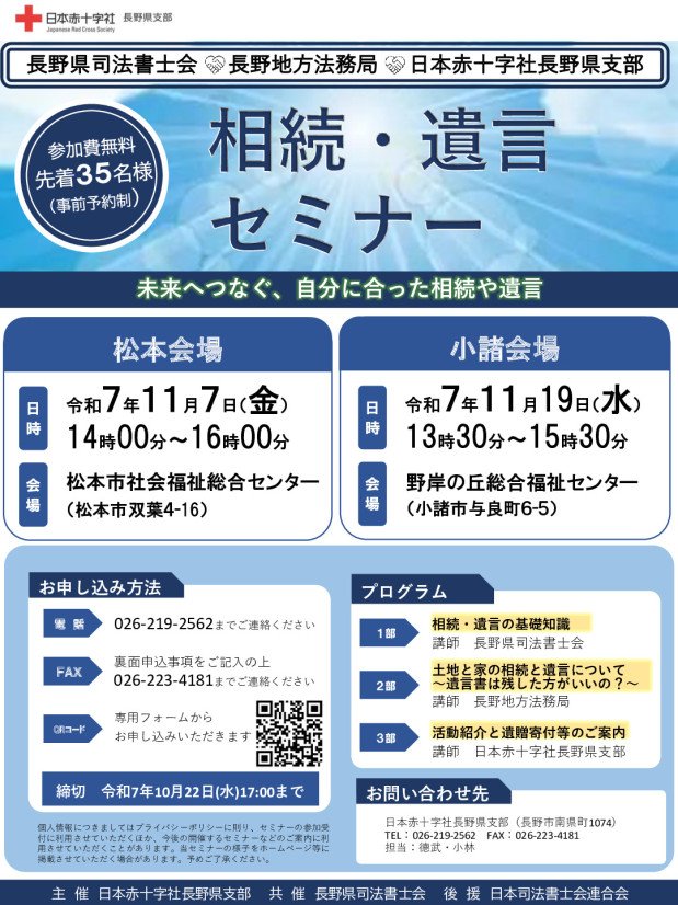 長野県司法書士会では、日本赤十字社長野県支部との共催、日本司法書士会連合会の後援により、「相続・遺言セミナー」を、下記のとおり開催します。