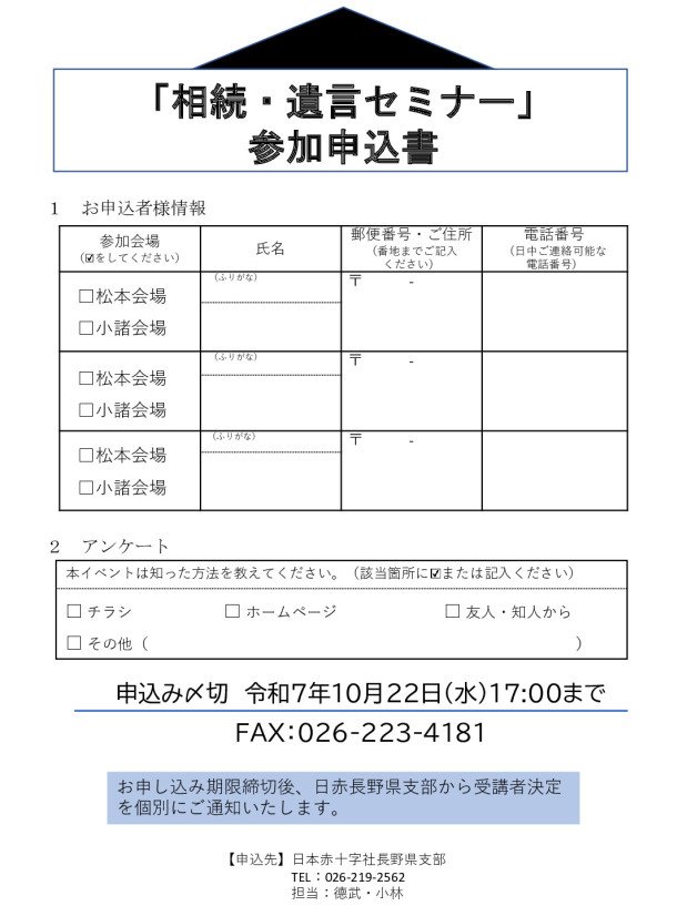 11月7日・19日に日本赤十字社長野県支部との共催に より「相続・遺言セミナー」を開催します。
