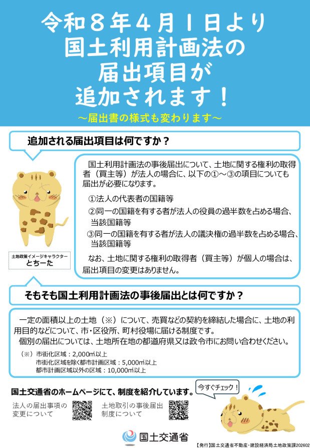 令和8年4月1日より国土利用計画法の届出項目が追加されます。