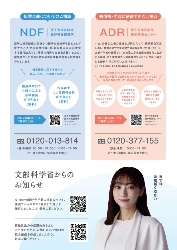 文部科学省にて、東電福島原発事故の損害賠償請求に関する相談窓口ならびに紛争解決窓口をお知らせする新しいチラシが作成されましたのでご覧ください。