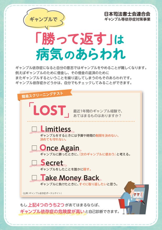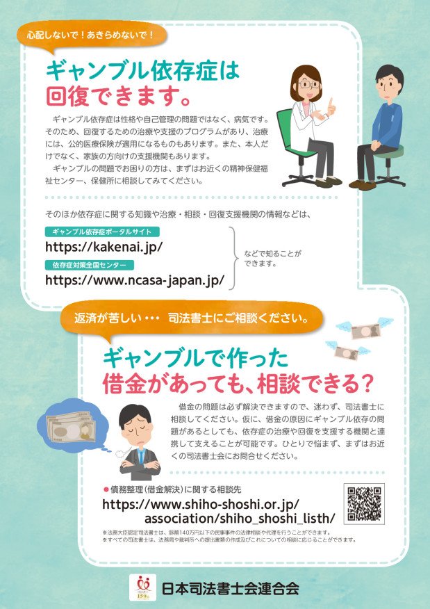 日本司法書士会連合会では、啓発週間の取組みの一環として「ギャンブル等依存症対策」のリーフレットを作成し