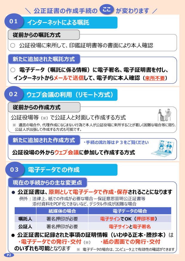 日本公証人連合会が作成した「公正証書作成手続のデジタル化」に関するリーフレットをご覧ください。