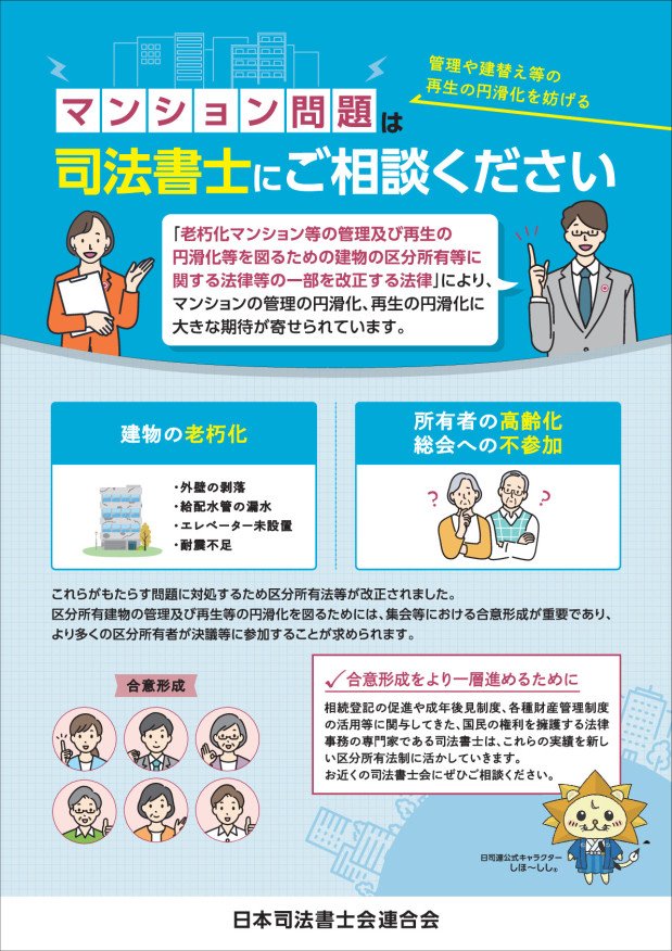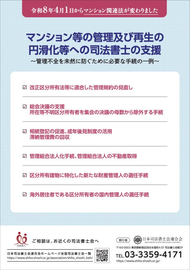 2026 年4月1日に建物の区分所有等に関する法律(改正区分所有法)が施行されます。日本司法書士会連合会では改正区分所有法に関するリーフレットを作成しましたのでご覧ください。