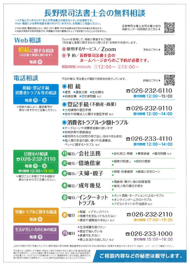 問合せ先 長野県司法書士会事務局(電話:026-232-7492)