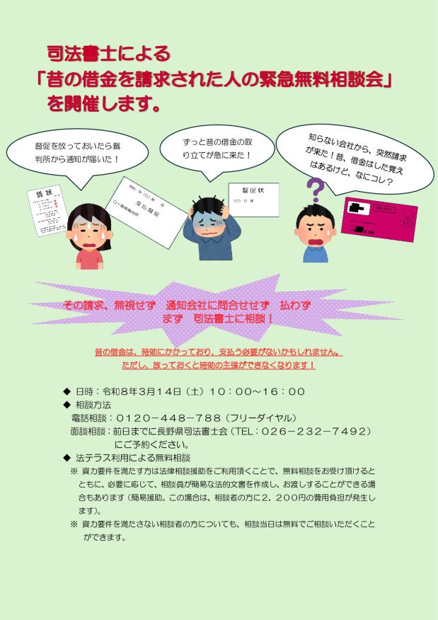 長野県司法書士会は、下記の要綱にて司法書士による借金に関する無料相談を実施いたします。