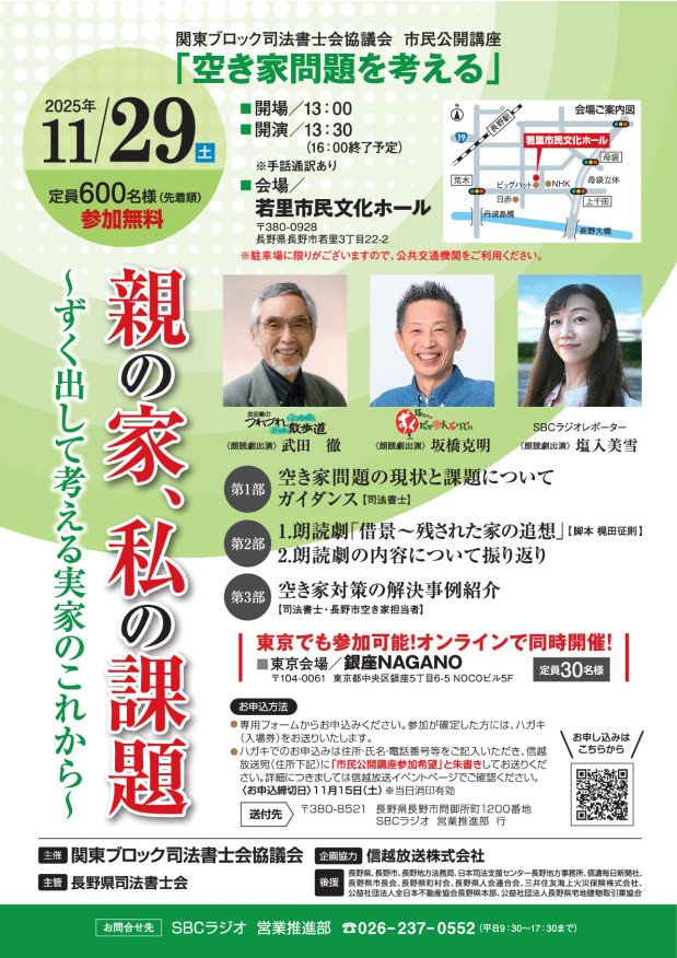 さらに本市民講座では、SBCラジオでおなじみの武田徹氏、坂橋克明氏、塩入美雪氏出演の親の家を題材にした朗読劇を、脚本家・梶田征則氏がこの日のためだけに書き下ろしたオリジナル脚本で熱演いただきます。
